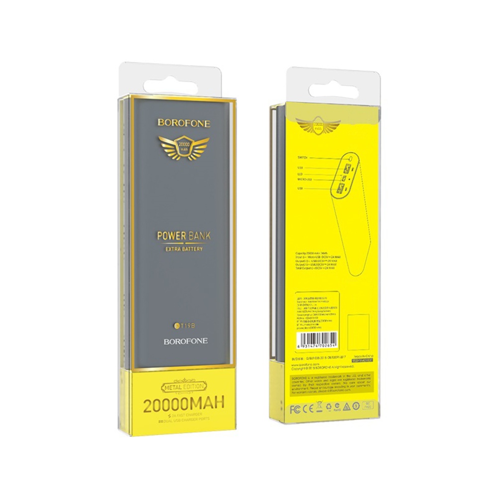 Power bank Borofone BT19B емкостью 20000mAh - стильный и необходимый аксессуар для активных пользователей электронных устройств. Внешний аккумулятор Borofone BT19B продлит автономную работу вашего смартфона, планшета или Смарт-часов. PowerBank оснащен двумя разъёмами USB и одним Micro-USB, это позволит заряжать одновременно несколько устройств. Белый LED индикатор отображает информацию об уровне заряда аккумулятора.
