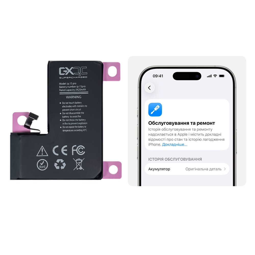 Аккумулятор GXQC Supercharged для Apple iPhone 15 Pro IC Original New (без ошибки), усиленный (3420 mAh) Service Pack