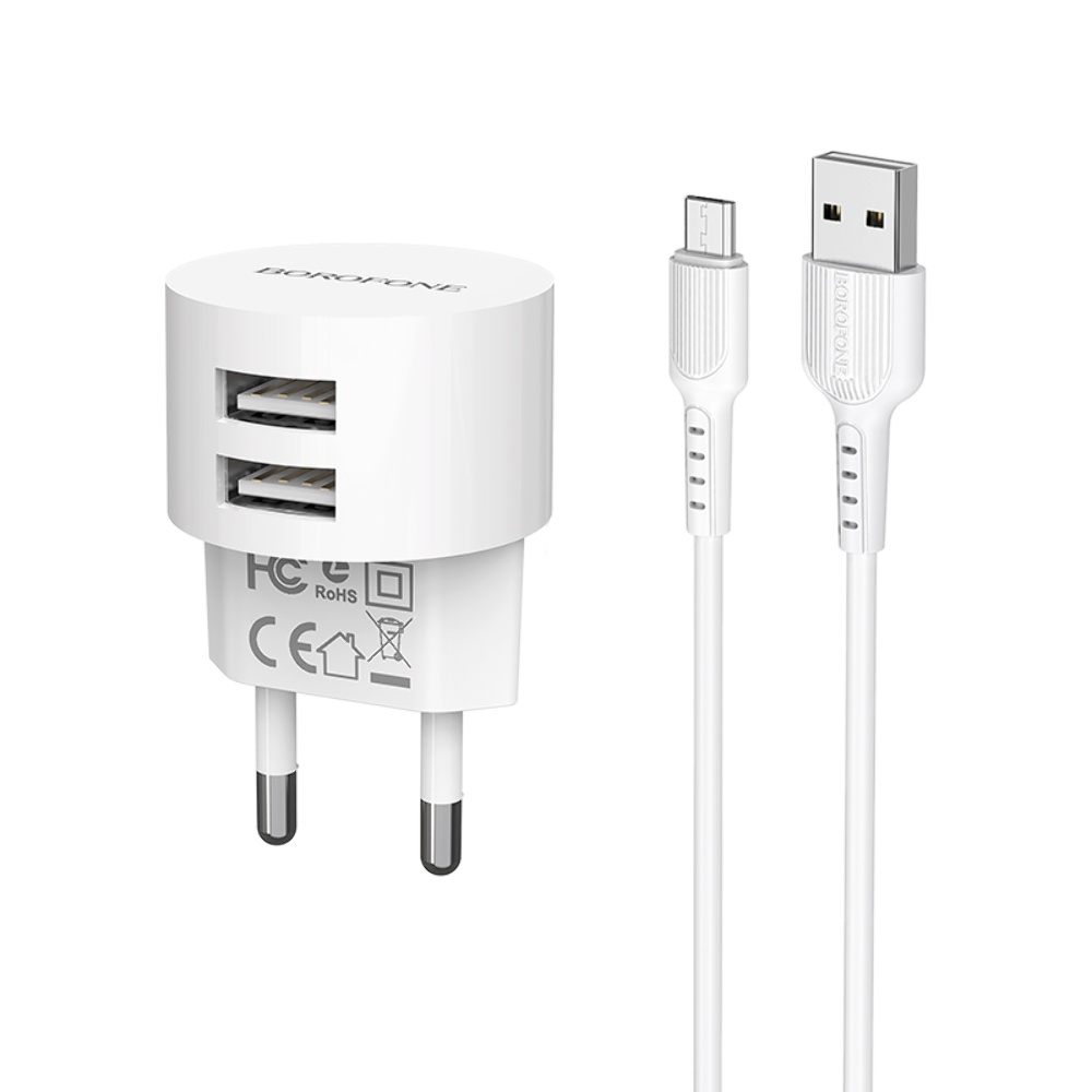 Мережевий зарядний пристрій Borofone BA23A 2 USB білий + кабель USB to MicroUSB