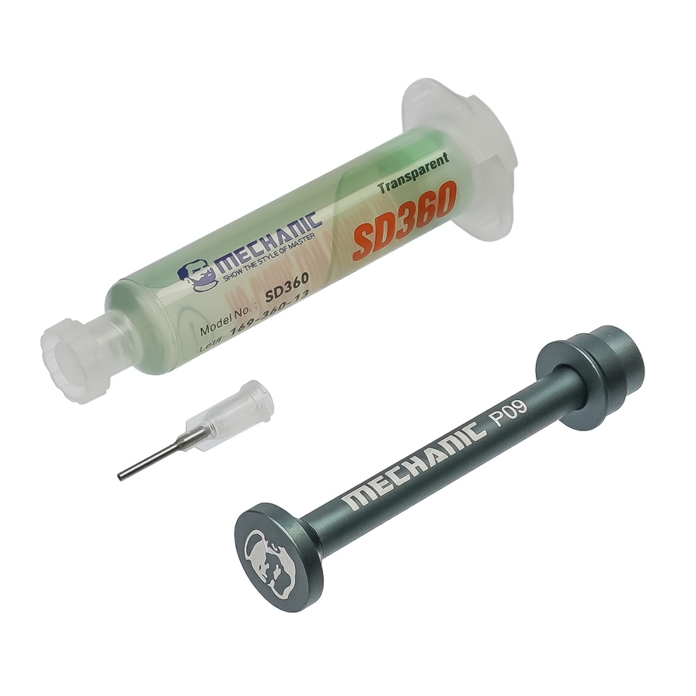 Флюс-паста MECHANIC SD360 10мл у шприці з алюмінієвимштовхачем P08 - це безвідмивний флюс, що використовується при пайці електронних компонентів. Він має унікальну формулу, яка забезпечує стабільний і якісний контакт між паяльним припоєм і поверхнею, що дозволяє уникнути утворення порожнеч, тріщин і інших дефектів.