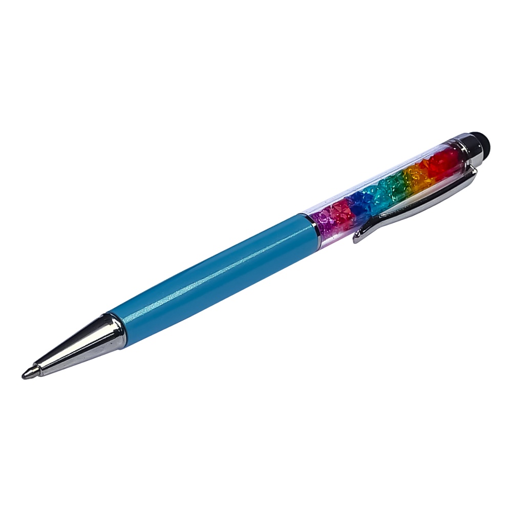 Стилус ємнісний, з кульковою ручкою, металевий, блакитний з кристалами кольорів веселки