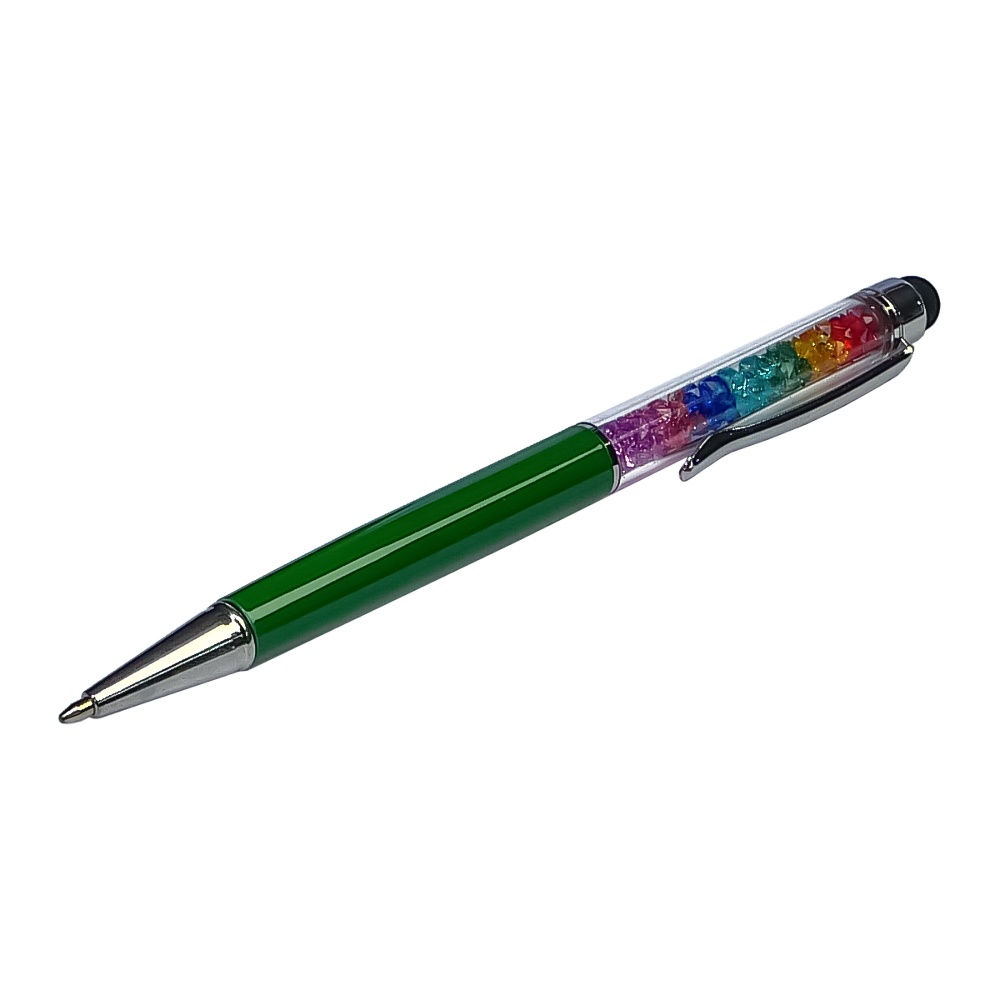 Стилус ємнісний, з кульковою ручкою, металевий, зелений з кристалами кольорів веселки
