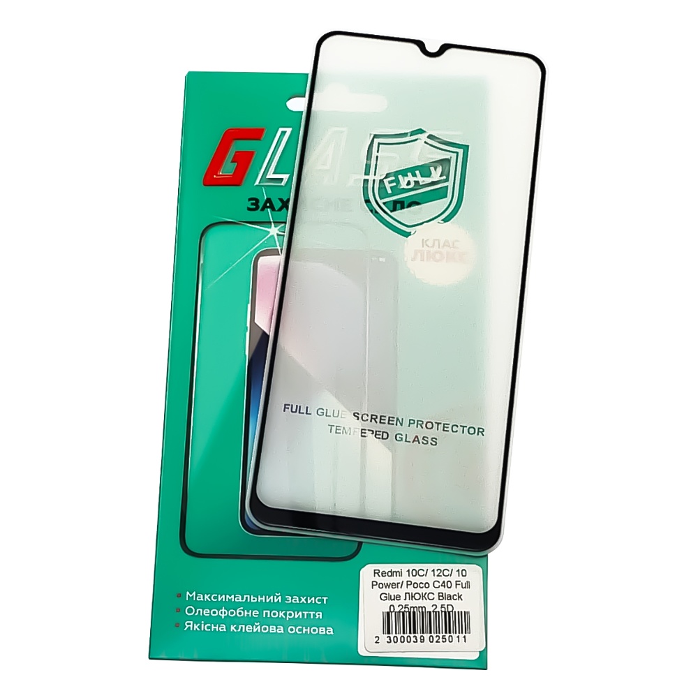 Захисне скло для Xiaomi Redmi 10C/ 12C/ 10 Power/ Poco C40 Full Glue (0.25 мм, 2.5D, чорне) Люкс