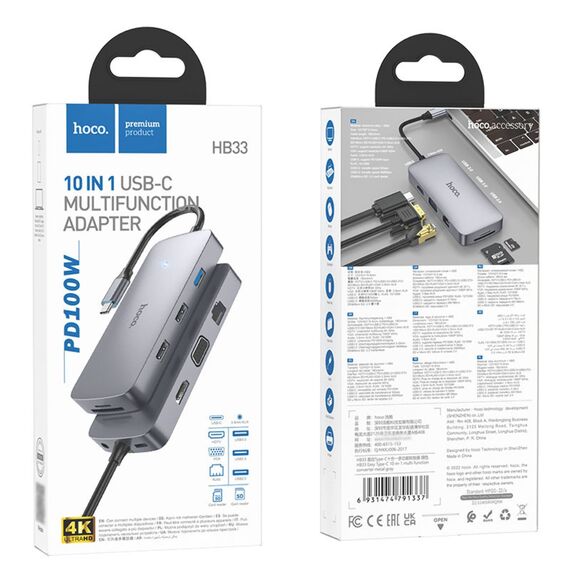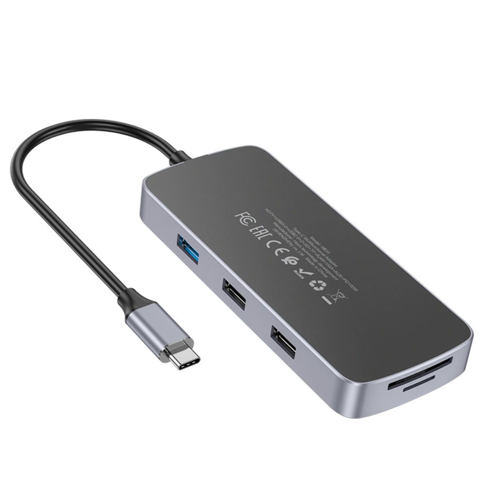 Мультиадаптер хаб Hoco HB33 10в1 Type-C to USB 3.0/ 2 USB 2.0/ Type-C/ HDMI/ VGA/ RJ45/ AUX/ SD/ TF PD 100W 0.18m сірий