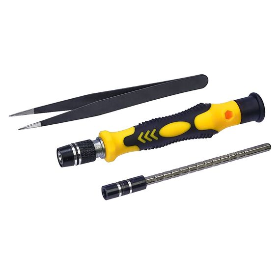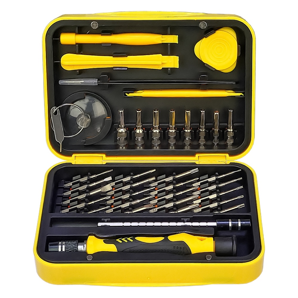 Набір інструментів Aida A-8819 є комплектом необхідних інструментів для розбирання і ремонту різних електронних пристроїв. Він включає ручку зі зручним захопленням і різноманітні насадки для роботи з різними видами гвинтів і кріпильних елементів.