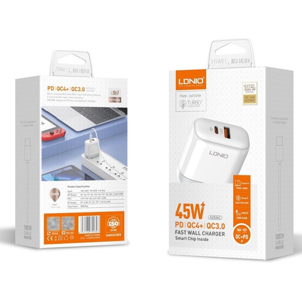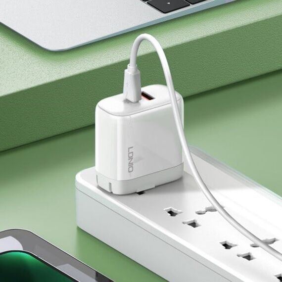 Мережевий зарядний пристрій Ldnio A2526C USB/ Type-C QC PD 45W білий + кабель Type-C to Lightning - ваш вірний помічник для швидкого заряджання безлічі пристроїв з впевненістю в безпеці використання.