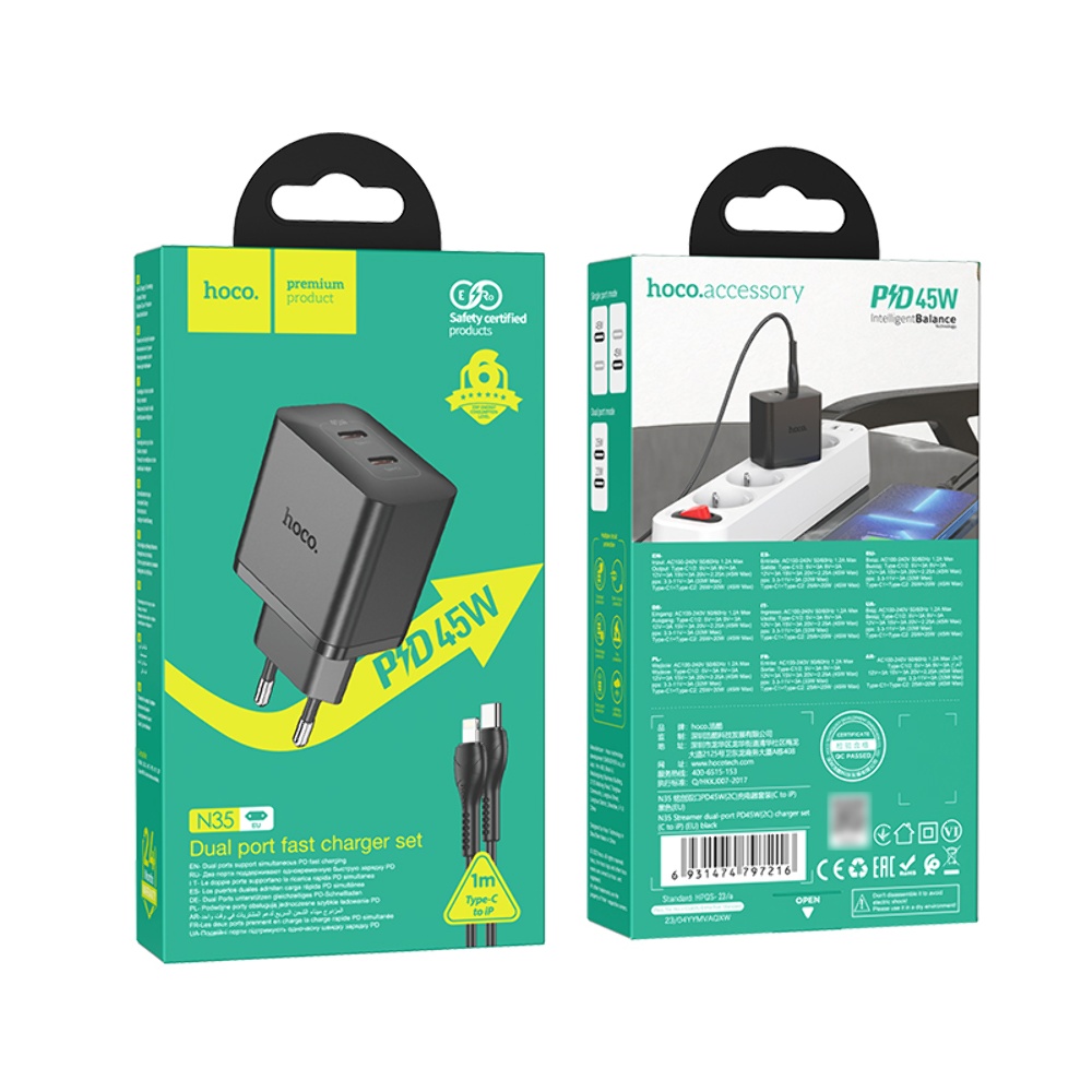 Мережевий зарядний пристрій Hoco N35 2 Type-C PD 45W чорний + кабель Type-C to Lightning - це надійний зарядний пристрій, який забезпечить швидку зарядку для ваших пристроїв.