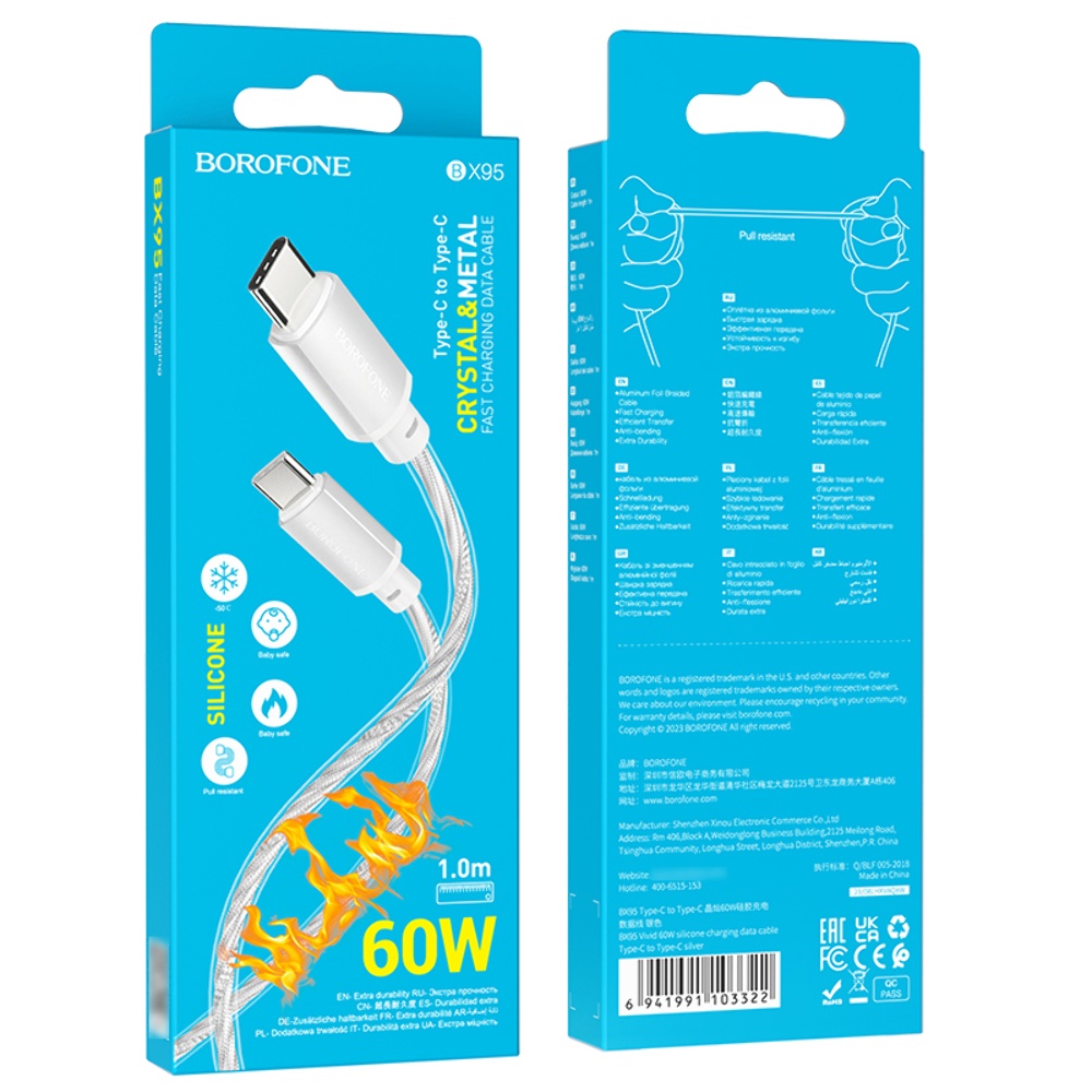 Кабель Borofone BX95 Type-C to Type-C PD 60W сріблястий 1m забезпечує високу потужність зарядки до 60W для ноутбуків і 3A для мобільних телефонів. Виготовлений із прозорого силікону з алюмінієвою фольгою в техніці плетіння, він надає надійне та швидке з'єднання між пристроями.