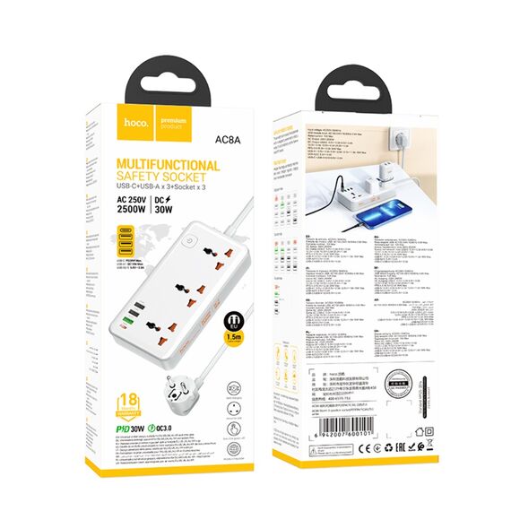 Мережевий зарядний пристрій подовжувач Hoco AC8A у білому кольорі — це потужне та універсальне рішення для заряджання та підключення різних пристроїв у вашому будинку.