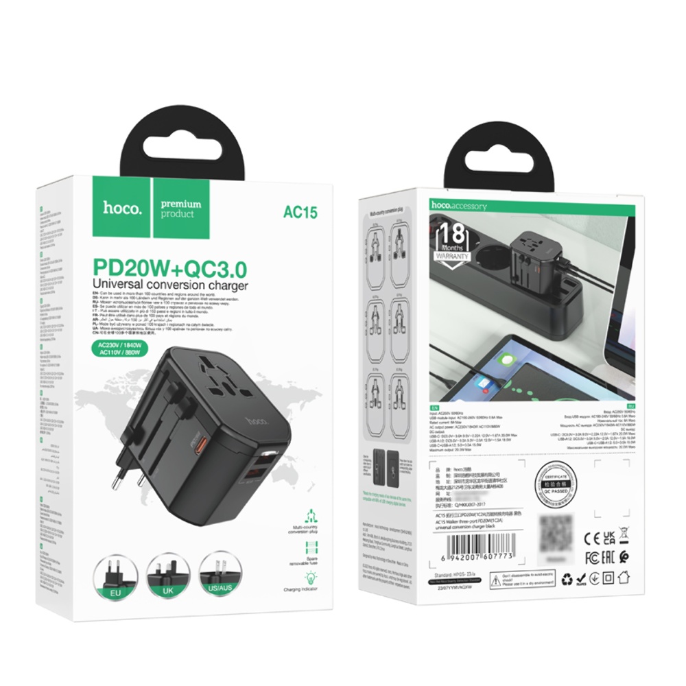 Мережевий зарядний пристрій Hoco AC15 2 USB/ Type-C 20W чорний