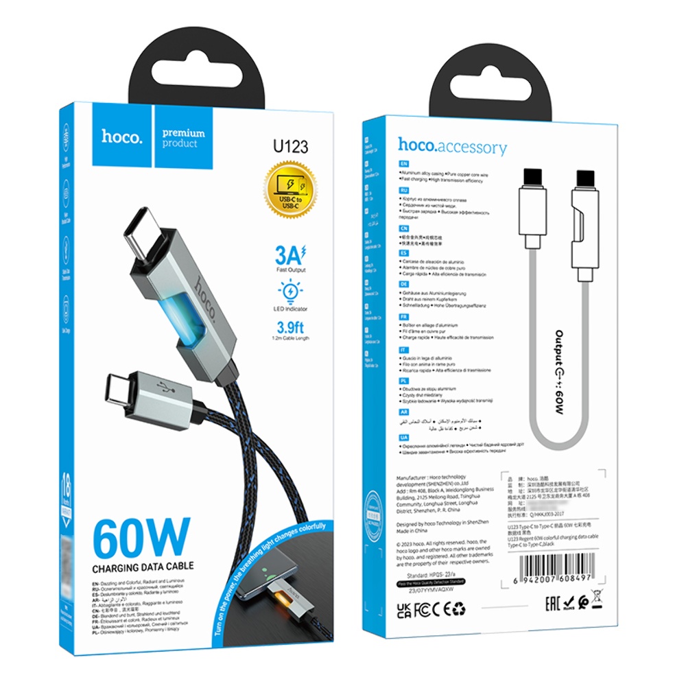 Кабель Hoco U123 з індикатором Type-C to Type-C PD 60W 1.2m black