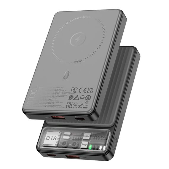 Power bank Hoco Q18 10000mAh PD 22.5W чорного кольору - це потужний і універсальний пристрій для заряджання з підтримкою як дротової, так і бездротової зарядки. Його ємність 10000mAh та підтримка швидкої зарядки роблять його ідеальним вибором для користувачів, яким потрібне швидке та надійне живлення для мобільних пристроїв. Магнітна функція MagSafe дозволяє легко позиціонувати та заряджати сумісні моделі iPhone, що додає зручності у використанні.