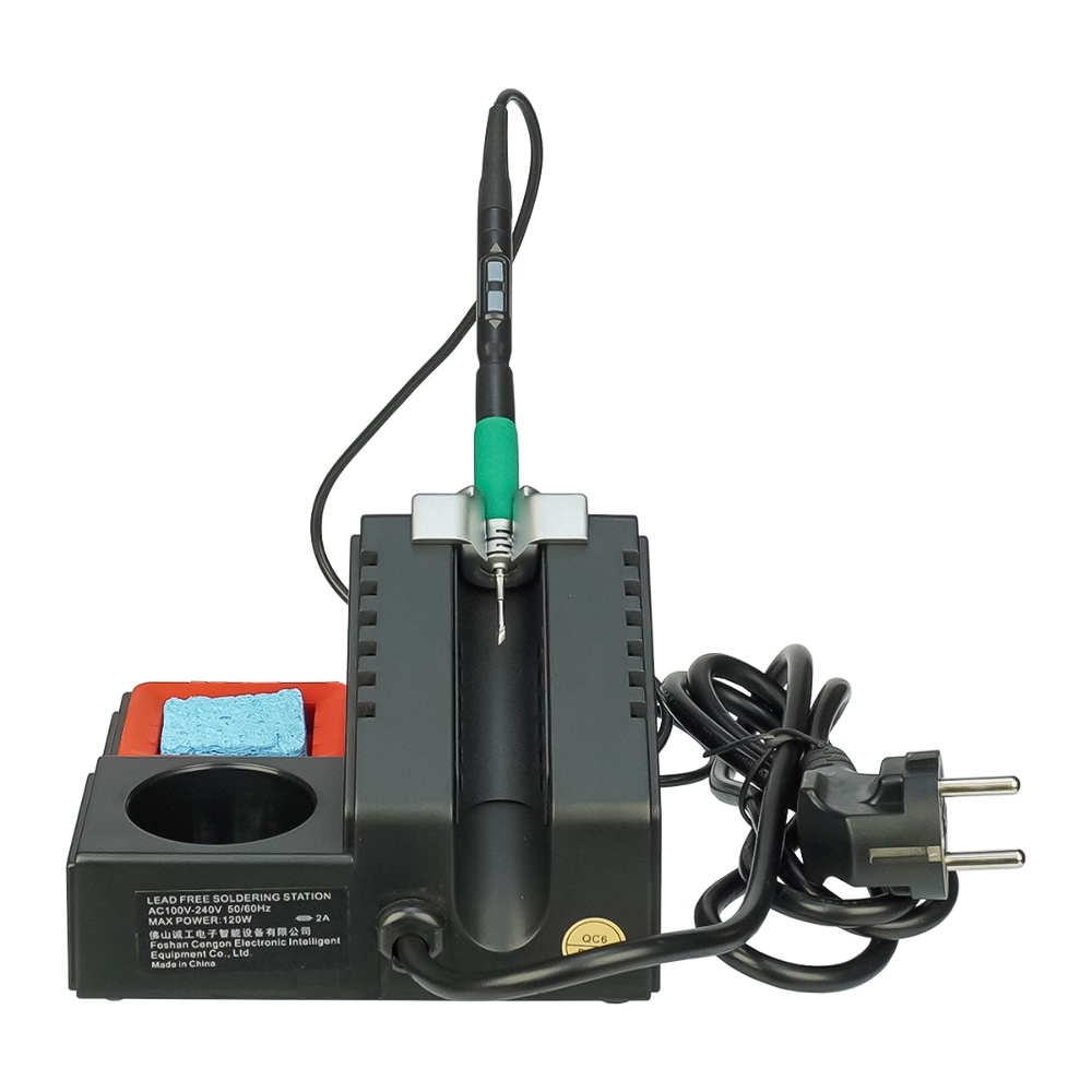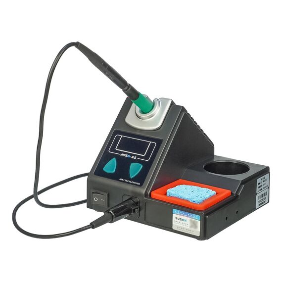 - Паяльна станція укомплектована практичною підставкою для паяльника, губкою для очищення, ємністю для зберігання різних дрібних інструментів і аксесуарів.