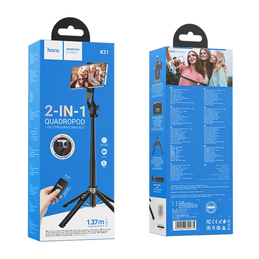 Штатив-трипод Hoco K21 чорного кольору (модель K21) є зручним і багатофункціональним пристроєм для зйомки на мобільних телефонах.