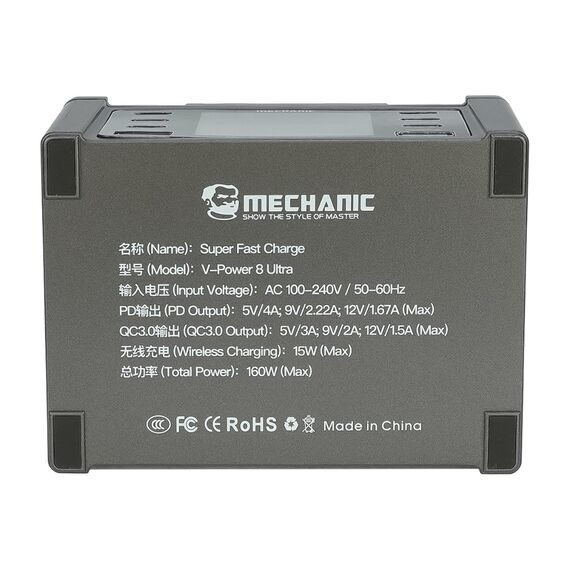 Зарядна станція з індикацією параметрів заряджання Mechanic V-Power 8 Ultra 160W - це універсальне рішення для швидкого та зручного заряджання різних пристроїв. З її допомогою ви зможете одночасно заряджати до восьми гаджетів, завдяки величезній кількості портів і потужної агрегатної потужності в 160 Вт. Станція підтримує як дротову, так і бездротову зарядку, що робить її ідеальною для використання вдома або в офісі.
