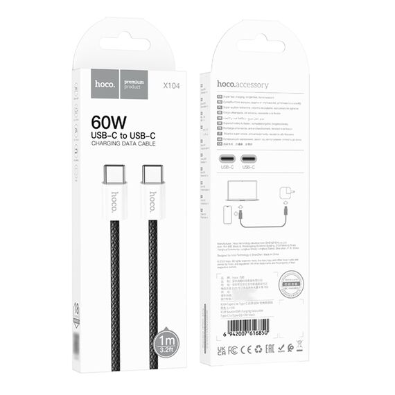 Кабель Hoco X104 у чорному кольорі - це надійне рішення для підключення пристроїв з роз'ємом Type-C з підтримкою PD 60W, забезпечуючи швидку та ефективну зарядку.