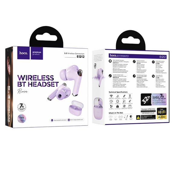 Бездротові TWS навушники Hoco EQ12 вакуумні в бузковому кольорі є стильним і зручним рішенням для прослуховування музики та дзвінків без дротів. Ці навушники забезпечують якісне звучання та комфортне носіння протягом тривалого часу.