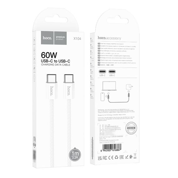 Кабель Hoco X104 у білому кольорі - це надійне рішення для підключення пристроїв з роз'ємом Type-C з підтримкою PD 60W, забезпечуючи швидку та ефективну зарядку.
