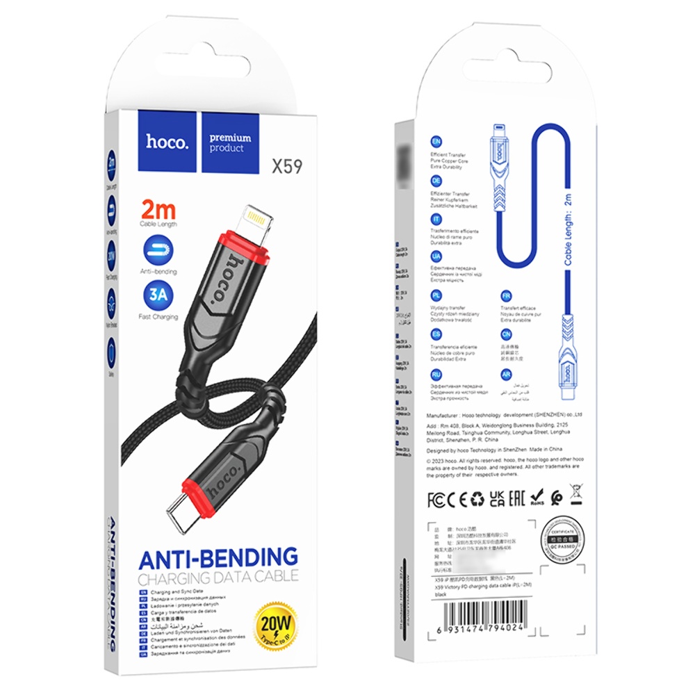 Кабель Hoco X59 Type-C to Lightning 2m black є високоякісним аксесуаром, призначеним для швидкого заряджання і передачі даних між пристроями з роз'ємами Type-C і Lightning. Завдяки міцному нейлоновому обплетенню та подовженому сітчастому захисту з'єднувачів, цей кабель забезпечує довговічність і надійність використання.