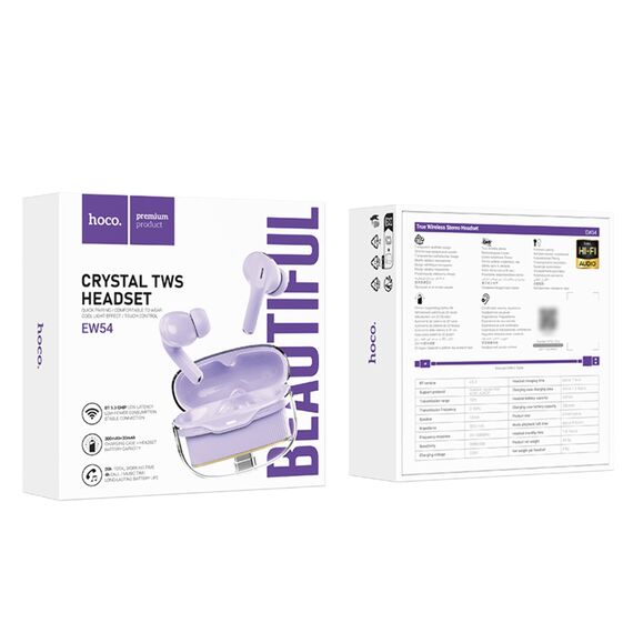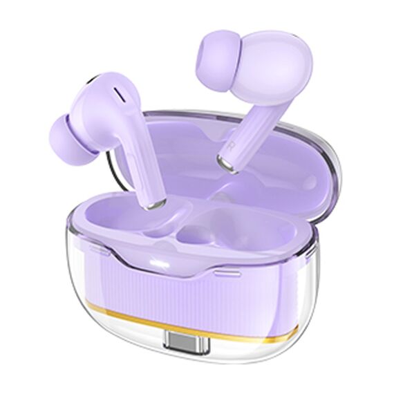 Бездротові TWS навушники Hoco EW54 у фіолетовому кольорі забезпечують відмінну якість звуку та зручність використання. Вони оснащені Bluetooth 5.3 і підтримують швидкий зв'язок з пристроями. Час роботи навушників складає 4 години, а зарядний кейс має ємність 300 мАг.