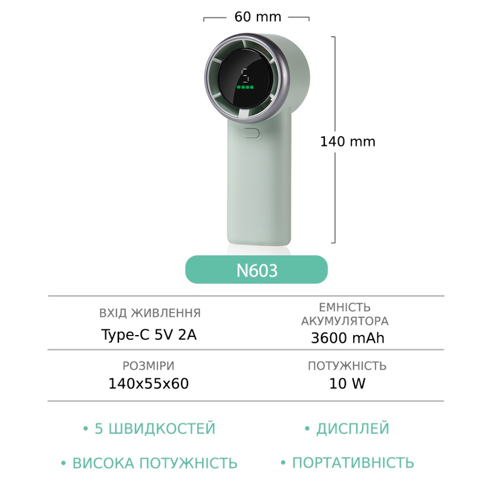 Ручний бездротовий вентилятор GXQC N603 зелений забезпечує потужне охолодження та портативність, ідеально підходячи для використання вдома, на вулиці або у подорожах. Його стильний зелений дизайн та висока функціональність роблять його чудовим вибором для спекотних днів.