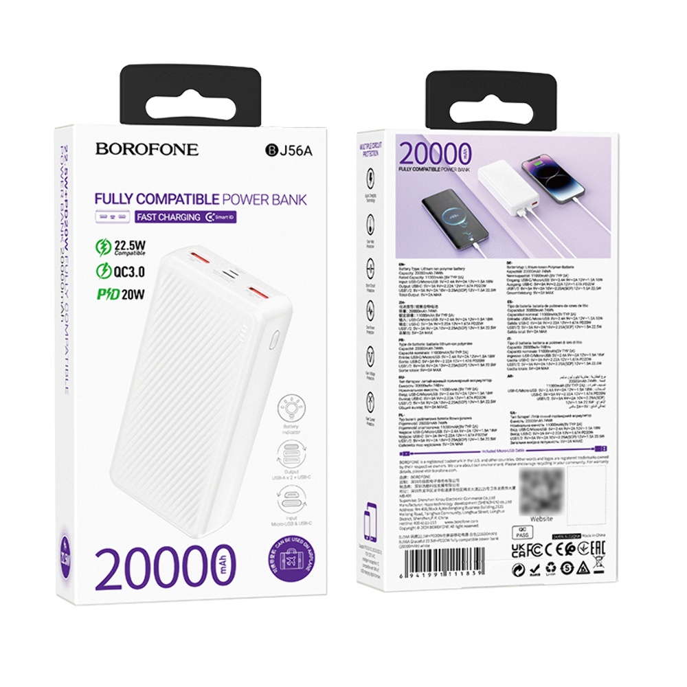 Power bank Borofone BJ56A 20000mAh білий — це потужне та надійне рішення для заряджання ваших пристроїв. Корпус виконаний із міцного ABS/PC пластику, що гарантує його довговічність, а LED-індикатор допомагає відстежувати рівень заряду літій-полімерного акумулятора.