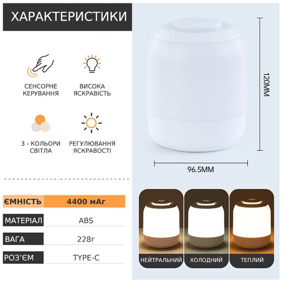 Настільний LED нічник з 3 кольорами, регулювання яскравості 4000 mAh білий