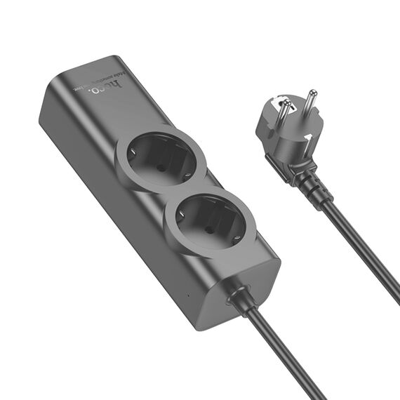 Мережевий зарядний пристрій подовжувач Hoco NS10 USB/3 Type-C PD 67W 2 розетки 2m black об'єднує функції подовжувача та потужного зарядного пристрою, підтримуючи зарядку до чотирьох пристроїв та підключення двох розеток.Чорний дизайн та довгий кабель ідеальні для дому чи офісу.