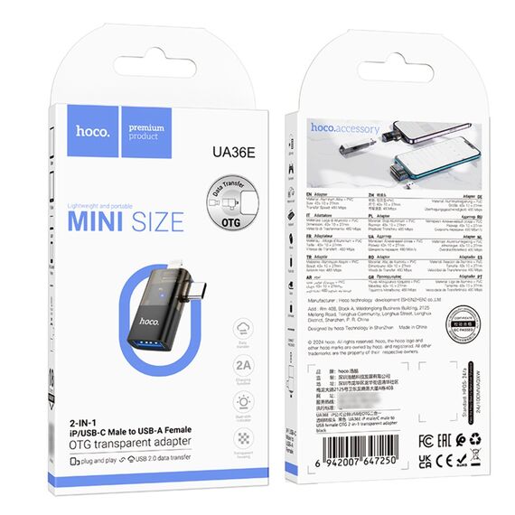 Адаптер перехідник Hoco UA36E 2в1 Lightning/Type-C to USB black - ідеальне рішення для тих, хто шукає зручний та функціональний спосіб підключення різних пристроїв. Він підтримує з'єднання Lightning male та Type-C male з USB female, що робить його універсальним інструментом для обміну даними та заряджання.