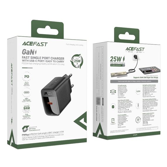 Мережевий зарядний пристрій Acefast A104 Type-C PD25W чорний – це надійний пристрій для швидкого заряджання гаджетів. Він поєднує в собі потужність, компактні розміри та сучасні технології, що робить його ідеальним вибором для використання вдома та у поїздках.