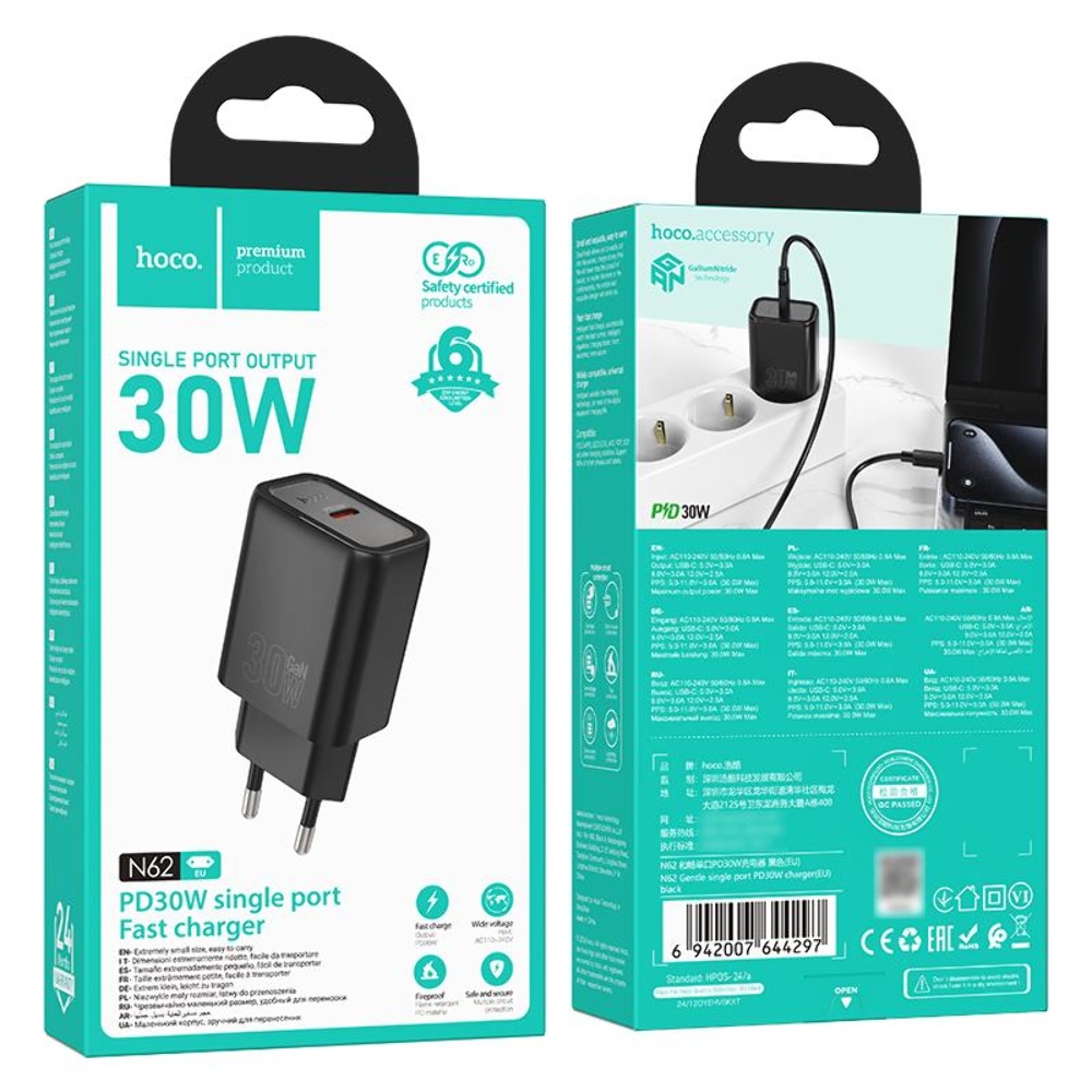 Мережевий зарядний пристрій Hoco N62 Type-C PD 30W black - це потужний і компактний пристрій, призначений для швидкого заряджання ваших гаджетів. За допомогою технології Power Delivery та різних протоколів швидкої зарядки, він ідеально підходить для сучасних смартфонів та планшетів, забезпечуючи надійність та зручність у використанні.