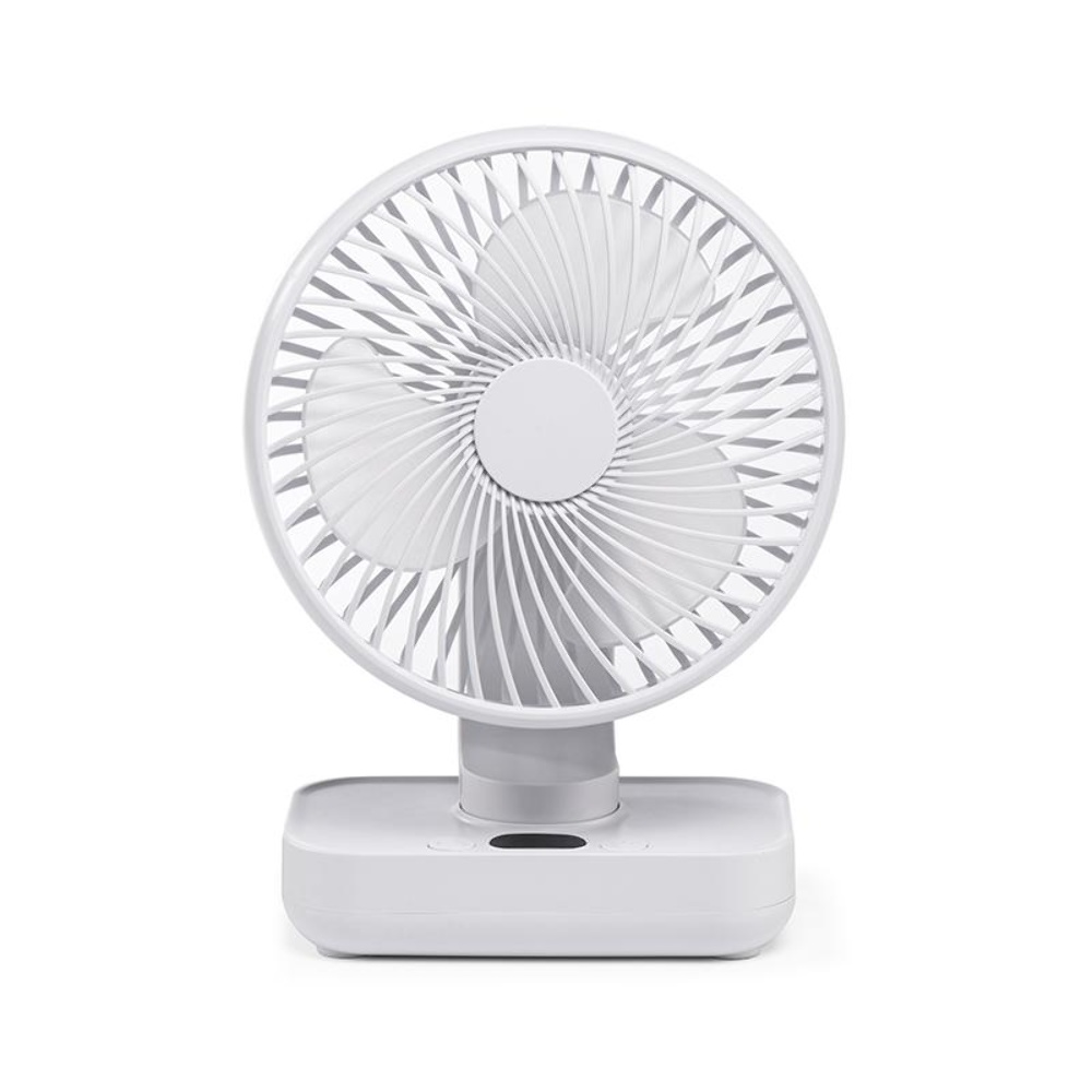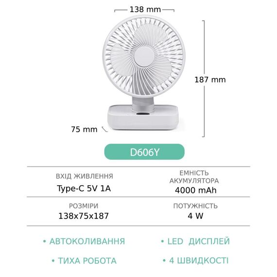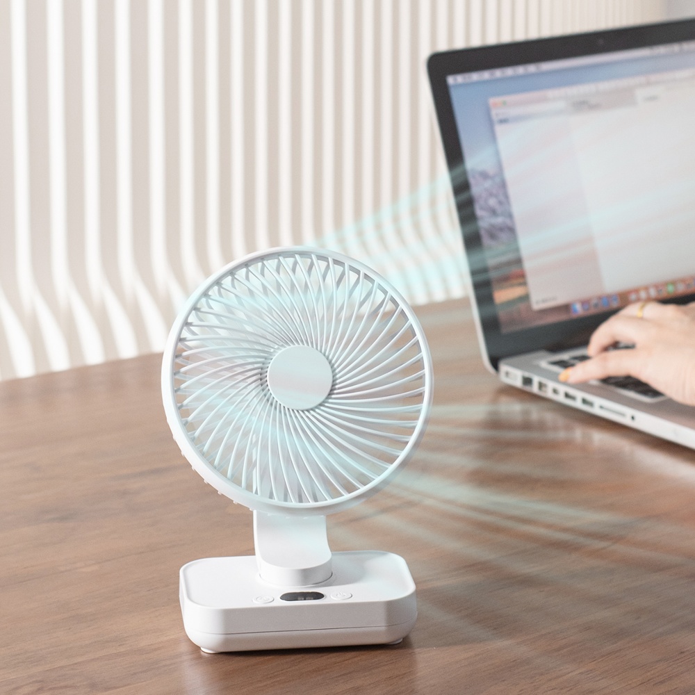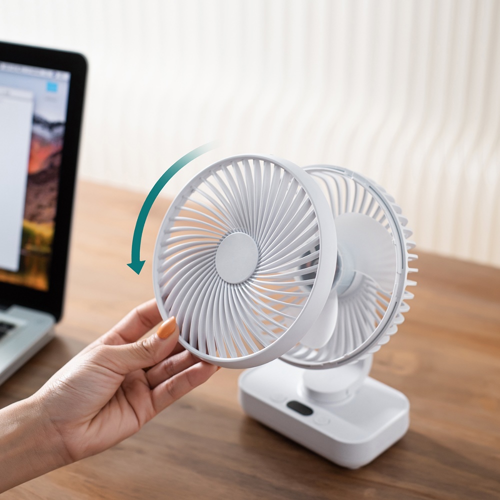 Настільний бездротовий вентилятор GXQC D606Y white - компактний і потужний портативний вентилятор з безщітковим двигуном. Оснащений 18650 літієвою батареєю ємністю – 4000 mAh, він забезпечить вам безперервний потік свіжого повітря до 8 годин. За рахунок можливості живлення від будь-якого USB порту 5V його можна підключити до мережного адаптера, повербанка або ноутбука за допомогою кабелю, що йде в комплекті.