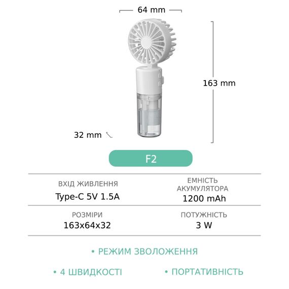 Ручний бездротовий вентилятор F2 з функцією зволоження (білий)