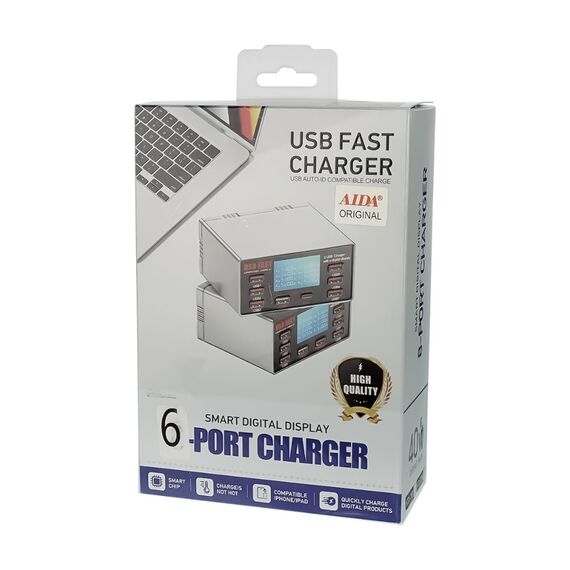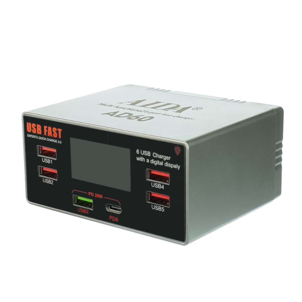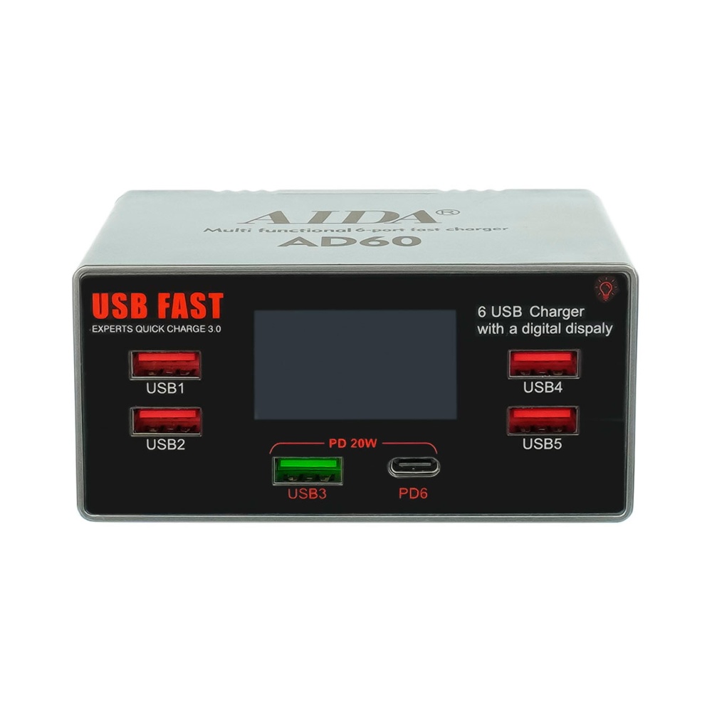 Зарядная станция с индикацией параметров зарядки Aida AD60 (4 USB 2А/ 1 USB QC 3.0A/ 1 Type-C PD 20W)