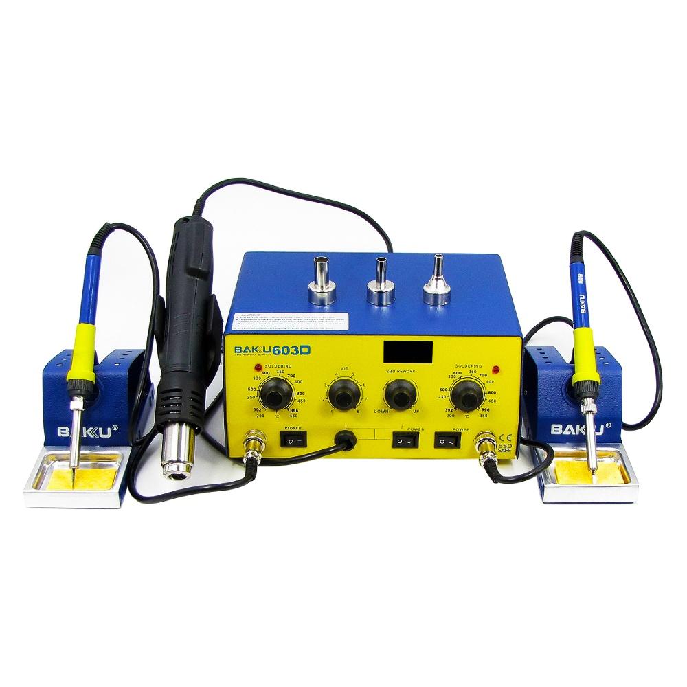 Паяльна станція BAKU BK603D – трьохканальна паяльна станція, яка забезпечує незалежне управління температурою двох паяльників, а також турбінного фена. У паяльної станції передбачені плавні регулювання двох паяльників, тобто кожне паяльне жало налаштовується на свою температуру. Обладнана термофеном, який відразу нагнітає і підігріває повітря за допомогою вмонтованої спіралі. Для комфортної роботи паяльна станція оснащена тримачем.